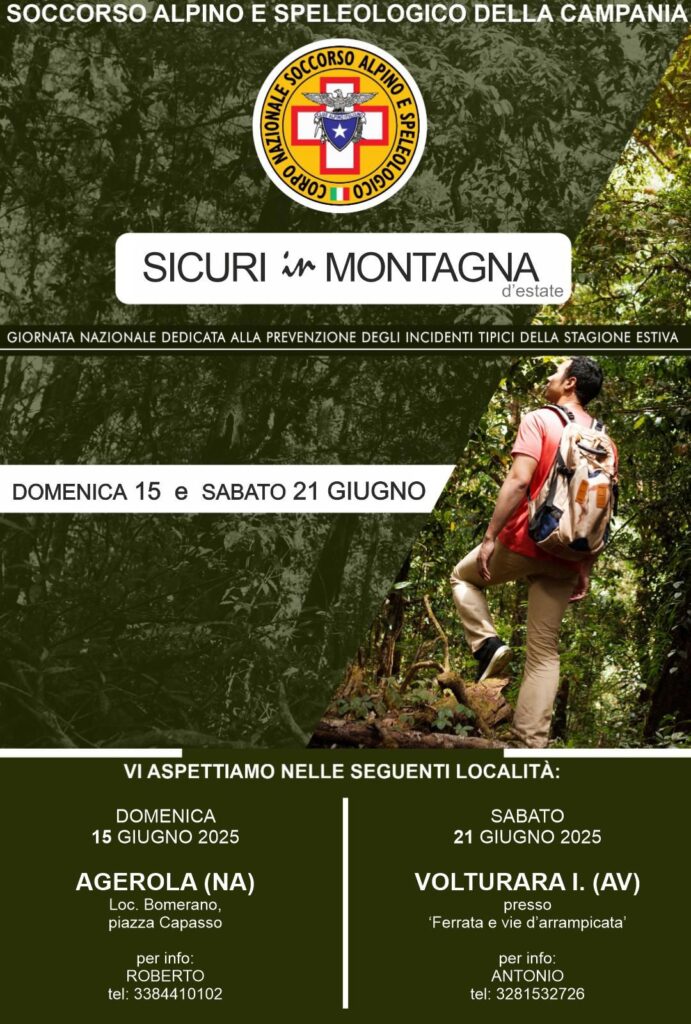La segreteria del Soccorso Alpino e Speleologico della Campania – S.A.S.C., comunica alle S.S.V.V. che il giorno 21 giugno 2025, nel Comune di Agerola (Bomerano, nei pressi del Sentiero degli Dei, Piazza Paolo Capasso), indicativamente dalle ore 09:00 alle ore 15:00, maggiori informazioni nell’allegato: